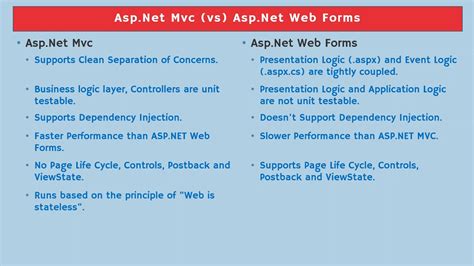 The most fundamental difference is their underlying architectural pattern. ASP.NET MVC is built on the Model-View-Controller pattern, as we discussed. This pattern enforces a clear separation of concerns: data (Model), presentation (View), and user input handling (Controller). This separation leads to more organized, testable, and maintainable code. You explicitly define how requests flow through your application. ASP.NET Web Forms , on the other hand, uses an event-driven, postback-based model. It mimics desktop application development. You work with server controls, and when users interact with them, events are fired on the server. The framework handles the state management and rendering behind the scenes, abstracting away much of the HTTP communication. This means you’re less directly involved with the HTTP request/response cycle.