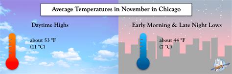 First off, when we talk about November temperatures in Chicago, we’re looking at a significant drop from October. The average daily temperature starts the month around 7-8°C (45-46°F) and by the end of November, it’s typically hovering around 1-2°C (34-36°F). That might sound like a big swing, but it’s gradual, so you won’t be hit with a sudden arctic blast on day one. The average high temperature in early November is usually in the 10-12°C (50-54°F) range, while the average low will be around 3-5°C (37-41°F). As the month progresses, those highs start dipping into the 5-7°C (41-45°F) zone, and the lows can frequently dip below freezing, especially in the latter half of the month, often reaching -2 to 2°C (28-36°F).