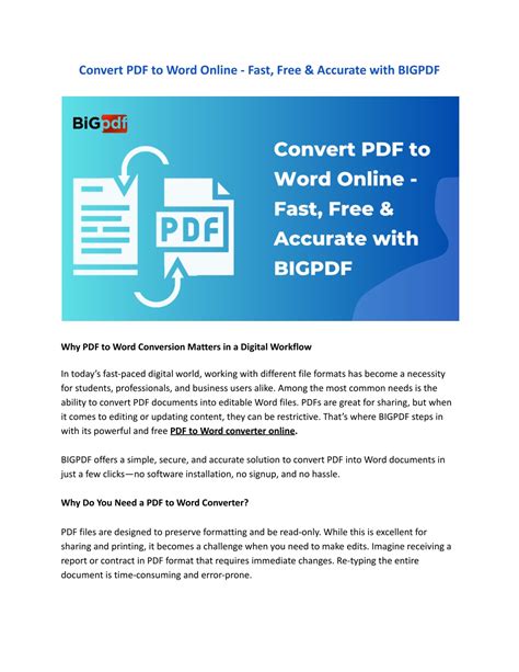 Okay, so now that we’re all hyped up about PDFs, let’s talk about the star of the show: BigPDF 11zon . This isn’t just another clunky online converter; it’s designed to be user-friendly and efficient , making your Word to PDF conversion process as smooth as possible. Seriously, guys, finding a reliable and easy-to-use tool can be a lifesaver, especially when you’re in a rush or dealing with a bunch of documents. BigPDF 11zon aims to be that go-to solution. It understands that not everyone is a tech wizard, and the last thing you need is a complicated interface or a confusing set of options when you just want to convert a file. The core idea behind BigPDF 11zon is simplicity. You upload your Word document (think .doc or .docx files), and it handles the rest, spitting out a clean, perfectly formatted PDF file for you to download. No hidden fees, no complicated software to install – just a straightforward, effective online tool. It’s built to handle the conversion quickly, so you’re not left waiting around forever. This is especially awesome when you’ve got multiple files to process or when you’re on a deadline. The team behind BigPDF 11zon is focused on providing a high-quality conversion experience . This means they pay attention to the details – preserving your fonts, images, tables, and overall layout. They aim to reduce the chances of those dreaded formatting errors that can plague other conversion methods. Think of it as a digital tailor for your documents, ensuring everything fits perfectly in its new PDF suit. Whether you’re converting a single page or a lengthy manuscript, BigPDF 11zon is geared up to handle it. It’s a testament to how modern web tools can simplify complex tasks, allowing you to focus more on creating great content and less on the technicalities of file formats. We’ll get into the actual steps in a bit, but just know that when you choose BigPDF 11zon, you’re choosing a tool that prioritizes ease of use, speed, and the fidelity of your original document. It’s about making a necessary task less of a chore and more of a seamless step in your workflow.