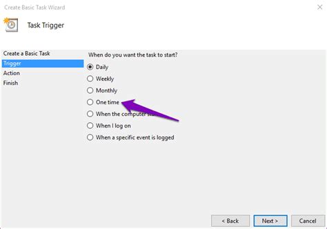4. Trigger: Choose when you want the task to start. You can choose from options like “Daily”, “Weekly”, “Monthly”, “One time”, “When the computer starts”, or “When a specific event is logged”. Select the option that best suits your needs and click “Next”.