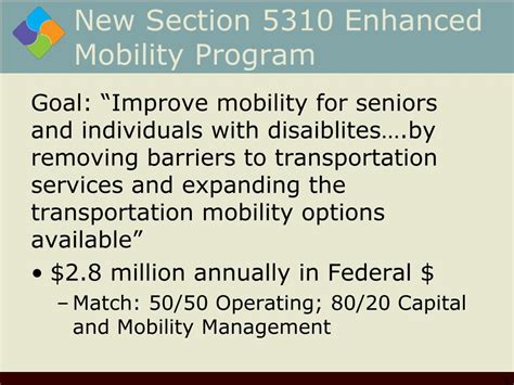 The core mission of the FTA Section 5310 program revolves around several key objectives, each designed to address the unique transportation challenges faced by seniors and individuals with disabilities. A primary aim is to expand the availability of accessible transportation options, ensuring that these populations can easily access medical appointments, grocery stores, social activities, and other essential services. This involves funding projects that acquire specialized vehicles equipped with features like wheelchair lifts, ramps, and securement devices, making transportation safer and more convenient. Another vital objective is to improve the coordination of transportation services, streamlining operations and eliminating service gaps. This is achieved through the development of coordinated transportation plans that bring together various transportation providers, including public transit agencies, non-profit organizations, and private operators, to create a seamless and efficient network. Additionally, the program seeks to foster innovative transportation solutions that leverage technology and creative approaches to address specific community needs. By supporting projects that pilot new technologies, implement demand-response systems, and explore alternative transportation models, Section 5310 encourages continuous improvement and adaptation to changing demographics and emerging challenges. Ultimately, the program’s objectives converge to create more inclusive, accessible, and sustainable communities where seniors and individuals with disabilities can thrive.