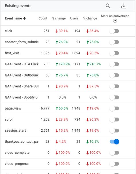 In GA4, setting up conversions is straightforward. You can mark any event as a conversion directly within the GA4 interface. For example, if you have a custom event called ‘form_submission,’ you can simply toggle a switch to designate it as a conversion. This flexibility allows you to track a wide range of actions as conversions, depending on your specific business goals. Enhanced measurement events, such as first visits or file downloads, can also be marked as conversions, providing additional insights into user behavior.
