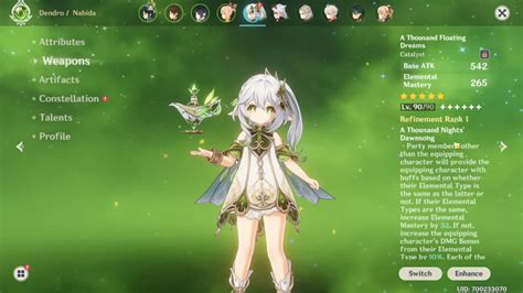 Choosing the right weapon for your Nahida sub-DPS build is crucial, guys, and thankfully, there are some stellar options that really amplify her strengths. The undisputed best-in-slot for almost any Nahida build, especially sub-DPS, is the A Thousand Floating Dreams . This 5-star catalyst is literally tailor-made for her. Its secondary stat boosts Elemental Mastery, which, as we’ve discussed, is super important for her Tri-Karma Purification damage. Plus, its passive grants an ATK bonus and an EM bonus to nearby party members based on the EM of the wielder. This means Nahida not only hits harder off-field but also buffs her teammates’ damage output significantly. If you’re lucky enough to pull this weapon, run, don’t walk, to put it on her.