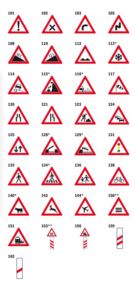 Alright, moving on to the signs that give you a heads-up about potential dangers ahead: the warning signs . These are typically triangular with a red border and a white or yellow background, featuring a symbol that depicts the hazard. Their purpose is to alert you so you can adjust your driving accordingly – slow down, be more attentive, or prepare for a change in road conditions. You'll see symbols for sharp curves (often with an arrow showing the direction), slippery roads (a wavy line), steep hills (uphill or downhill arrows), and animal crossings (like a deer or cow silhouette). There are also signs warning of pedestrian crossings, children playing, or cyclists. One particularly important warning sign depicts a series of upcoming bends, often indicating the direction of the first few. Be extra cautious when you see these! Some warning signs are temporary, indicating roadworks or construction ahead. These often use a yellow background to signify their temporary nature. Always take these warnings seriously. They are placed there for a reason, usually to prevent accidents. For instance, seeing a slippery road warning might mean you're approaching an area prone to ice or oil spills. An animal crossing sign means you need to be extra vigilant, especially at dawn and dusk, and be prepared to brake suddenly. The key with warning signs is to anticipate . Don't wait until you're right on top of the hazard to react. Use the warning sign as your cue to assess the situation, reduce your speed if necessary, and increase your awareness. It's about proactive driving, not reactive panic. So, while they might seem a bit alarming, these signs are actually your allies, helping you navigate potentially tricky situations safely. They are a crucial part of the German traffic management system, designed to keep everyone on the road as safe as possible.
