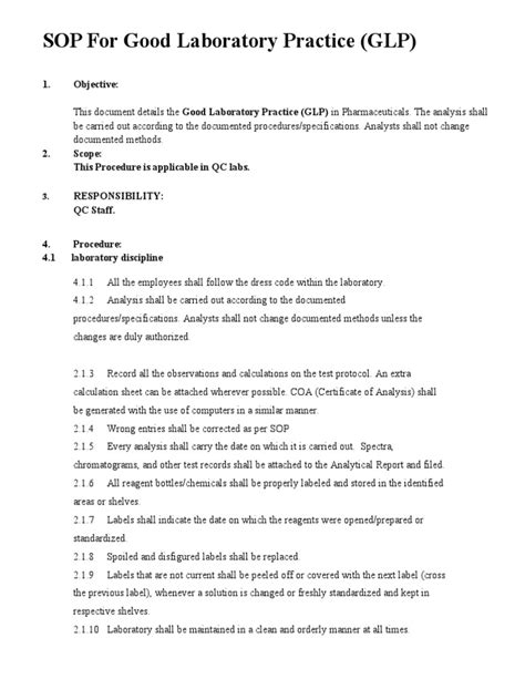 GLP Level 1 covers a range of essential topics. Here are some of the key components you’ll need to know. First, Standard Operating Procedures (SOPs) are your best friend. SOPs are the detailed, written instructions that tell you exactly how to perform a task. They’re like recipes for your experiments. Everyone in the lab needs to follow SOPs to ensure consistency and repeatability. These ensure that tasks are performed uniformly across the board, minimizing variability. Another crucial part of GLP Level 1 is personnel responsibilities . This section describes the role of each person in the lab, from the study director to the lab assistants. It also defines who is responsible for what, ensuring that everyone knows their duties and accountability. The roles and responsibilities are clearly defined to ensure that everyone understands their role in the study. Data integrity is everything in GLP. This includes ensuring your data is accurate, reliable, and traceable. Proper record-keeping is critical. This means keeping detailed records of every step of the process. Every observation, measurement, and change should be carefully recorded in a way that allows for easy retrieval. Another major point is the Quality Assurance (QA) unit. The QA unit is the independent group that monitors the studies to ensure that they are being conducted according to GLP standards. They’re the watchdogs of the lab, making sure that everything is on the up-and-up. Understanding the importance of QA is essential. The QA unit’s role in ensuring compliance is paramount, as they act as an independent check to uphold data integrity. These components form the foundation of GLP Level 1 understanding. Each component plays a vital role in maintaining the reliability and validity of scientific studies.