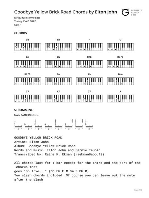 We’ve got the chords, we’ve got the structure, now let’s talk rhythm! A great song isn’t just about the notes; it’s about how you play them, and for “ Goodbye Yellow Brick Road ” on the ukulele, the strumming pattern is key. While the original song has a complex arrangement, we can simplify it for the uke to capture that signature feel. A really effective and common strumming pattern for this type of song is a variation of the Down-Down-Up-Up-Down-Up pattern. Let’s break that down: You’ll want to make four strums per chord. The first strum is a Down strum. The second is another Down strum. The third is an Up strum. The fourth is another Up strum. The fifth is a Down strum, and the sixth is an Up strum. So, it sounds like: Down - Down - Up - Up - Down - Up . Try practicing this pattern slowly on a single chord, like G Major. Feel the rhythm. Once you’re comfortable, start applying it to your chord progressions. For example, play G for four beats using this pattern, then move to D and do the same, then Em, then C. This pattern provides a good balance of down and up strokes, giving your playing a nice forward momentum, much like the original track. Another approach, especially for the verses, could be a simpler Down - Down - Up - Down - Up pattern, or even just Down - Down - Down - Down if you’re really focusing on chord changes. The most important thing is to listen to the song and try to mimic the feel. Does it sound like it’s rushing forward? Does it have a bit of a swing? Experiment! Sometimes, a slightly more syncopated pattern, like Down - Up - Down - Up - Down , can also work wonders. The key is to keep it steady . A metronome is your best friend here, especially when you’re first learning. Practice the pattern until it becomes second nature, until your strumming hand knows what to do without you even thinking about it. This frees up your mind to focus on the chord transitions and the overall feel of the song. For the chorus, you might want to strum a bit more forcefully or slightly faster to give it more energy. Don’t be afraid to vary the intensity of your strumming to match the dynamics of the song. This will make your performance much more engaging and professional-sounding. So, experiment with different patterns, but always come back to that core rhythm that feels right for “Goodbye Yellow Brick Road.” Your ukulele will thank you for it, and your audience will too!
