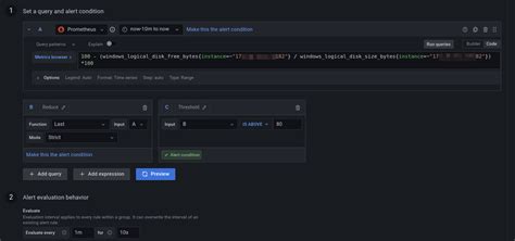 - Conditions : Define the conditions that must be met for the alert to fire. This typically involves setting thresholds for your metrics (e.g., “WHEN avg() OF query(A, 5m, now) IS ABOVE 80”).