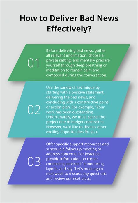 Now, let’s flip the script. What if you’re the one who has to deliver bad news ? This is arguably the tougher role, guys, because you’re the one creating the initial sting. It’s a responsibility that requires a significant amount of empathy , honesty , and preparation . First off, choose the right time and place. Whenever possible, deliver bad news in person or via video call, not through email or text. This shows respect for the recipient and allows for immediate feedback and emotional support. Avoid delivering it in a public or rushed setting. Find a private space where the conversation can happen without interruptions. Before you even open your mouth, plan what you’re going to say . Know your key message, the reasons behind it (if appropriate and helpful to share), and potential follow-up questions. Rehearse it if you need to. The goal is clarity and directness, but delivered with compassion. Start with a clear, unambiguous statement. Don’t beat around the bush or sugarcoat it excessively, as this can create confusion and false hope. For example, instead of saying, “We’re facing some challenges that might affect…”, try something more direct like, “I have some difficult news to share regarding…” followed by the actual news. Once you’ve delivered the news, pause and allow the person to react . Be prepared for a range of emotions. Listen actively to their response. Validate their feelings without necessarily agreeing with their accusations or opinions if they become overly emotional. Phrases like, “I understand this is upsetting,” or “I can see why you’re disappointed,” can go a long way. Offer support where you can. If it’s a work-related issue, outline any next steps, resources, or assistance that will be provided. If it’s personal, offer to help in practical ways if appropriate. Avoid making promises you can’t keep or offering false hope. Honesty is key, even when it’s difficult. Be prepared to answer questions honestly and to the best of your ability. If you don’t know the answer, say so and commit to finding out. Remember, your demeanor matters. Stay calm, composed, and respectful throughout the conversation. Your goal is to deliver the information as gently as possible while remaining truthful and professional. It’s about treating the other person with the dignity they deserve, even in a difficult moment. This approach not only softens the blow but also helps maintain trust and relationships, which are vital in any context, personal or professional. We’ll delve into more nuanced scenarios and how to adapt these principles to different situations, ensuring you’re equipped to handle even the most challenging conversations with confidence and care.