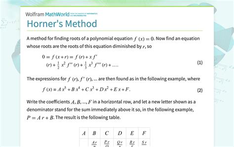 At its heart, Horner’s Method is an algorithm optimized for evaluating polynomials efficiently. Instead of calculating each term individually and then summing them up (which can be computationally expensive, especially for high-degree polynomials), Horner’s Method rearranges the polynomial into a nested form that minimizes the number of multiplications needed. This not only speeds up the calculation but also reduces the potential for rounding errors in computers. Think of it as a clever factorization trick that transforms a daunting calculation into a series of simple steps. The main keyword, Horner’s Method, is the cornerstone of understanding polynomial evaluation. It is a simple, yet powerful algorithm to evaluate polynomials efficiently by reducing the number of multiplications needed. Imagine you have a polynomial like this: P(x) = a_n*x^n + a_{n-1}*x^{n-1} + ... + a_1*x + a_0 . Instead of calculating each term a_n*x^n , a_{n-1}*x^{n-1} , and so on separately, Horner’s Method rewrites it in a nested form. This nested form looks something like this: P(x) = a_0 + x*(a_1 + x*(a_2 + ... x*(a_{n-1} + x*a_n)...)) . Notice how you’re now just doing repeated multiplications and additions. This minimizes the number of multiplications, making the whole process faster and less prone to errors. Let’s consider a polynomial P(x) = 4x^3 - 3x^2 + 2x - 1 . Using the traditional method, we would calculate 4*x*x*x - 3*x*x + 2*x - 1 . This requires multiple multiplications and additions. Now, let’s apply Horner’s Method. We rewrite the polynomial as P(x) = -1 + x*(2 + x*(-3 + x*4)) . To evaluate this at a specific value of x , say x = 2 , we start from the innermost parentheses and work our way outwards. First, we calculate -3 + 2*4 = 5 . Then, we calculate 2 + 2*5 = 12 . Finally, we calculate -1 + 2*12 = 23 . So, P(2) = 23 . See how we only performed a few simple multiplications and additions? This is the beauty of Horner’s Method. It transforms a complex calculation into a series of straightforward steps, making polynomial evaluation much easier and more efficient. Especially when dealing with high-degree polynomials or when performing calculations by hand, Horner’s Method can be a lifesaver.