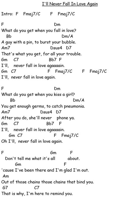 Let’s talk about strumming patterns . The rhythm is just as important as the chords themselves. For “I Will Never Fall in Love Again,” a simple strumming pattern like Down, Down, Up, Down, Up can work wonders. Focus on keeping a steady beat and maintaining a consistent rhythm. Experiment with different strumming patterns to find one that feels comfortable and sounds good to you. You can also try adding variations, such as muted strums or accents, to add some flair to your playing. Remember, the key is to keep the rhythm consistent and to match the feel of the song. Practicing with a metronome can be a great way to improve your timing and develop a solid sense of rhythm.