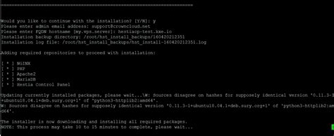 The installer will prompt you with a series of questions. You’ll be asked to confirm the installation and enter your admin email address and hostname. The hostname is important; it’s how your server will identify itself on the network. Make sure you set it to your fully qualified domain name (FQDN), such as server.yourdomain.com . It is very important. After answering these prompts, the installation will begin. This process takes a while – usually 10-30 minutes, depending on your server and internet connection speed. So, grab a coffee, and chill for a bit. During the installation, HestiaCP will install all the necessary components: a web server (like Nginx or Apache), PHP, a database server (like MariaDB), and an email server. It’ll also configure everything automatically.