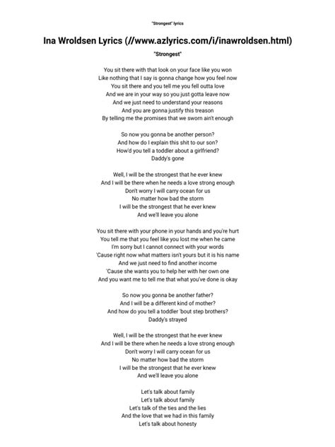 Moreover, the cultural and historical context in which the song was written can also add significant layers to your understanding. Were there specific events or societal issues that influenced the songwriter? Knowing this background can shed light on why certain themes are emphasized and why the lyrics resonate so strongly with particular audiences. Think about songs from the Civil Rights Movement, for example. Their power isn’t just in the melody or the voice of the singer, but in the message of hope and resistance they conveyed during a turbulent time. Similarly, “Strongest” may have its roots in specific experiences or observations that shaped its creation. Delving into this context can provide a richer, more nuanced interpretation of the lyrics, transforming your listening experience from passive to active and engaged. So, as you listen, don’t just hear the words – feel them, explore them, and let them speak to your own strength and resilience.