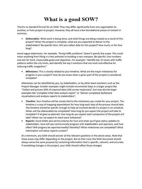 So, you’re probably thinking, “Do I really need a formal Statement of Work for every little thing?” And the answer, guys, is a resounding yes , especially for anything beyond the most trivial tasks. The importance of a well-drafted SOW cannot be overstated in the business world. Let’s dive into why it’s an absolute must-have. Firstly, clarity and alignment . This is perhaps the biggest benefit. A SOW ensures that both parties – the provider of the service and the client receiving it – have a crystal-clear, shared understanding of the project’s objectives, scope, deliverables, and timeline. It eliminates assumptions and guesswork. When everyone knows exactly what’s expected, the chances of misunderstandings, disputes, and costly errors plummet. Scope management is another huge win. Projects, especially in creative or tech fields, are notorious for “scope creep” – where the project grows beyond its original objectives. A SOW acts as a definitive guide, a reference point to measure any proposed changes against. If a request falls outside the defined scope, it’s immediately apparent, allowing for proper change control procedures, which might involve adjusting timelines or budgets. This prevents projects from spiraling out of control and becoming unmanageable or unprofitable. Risk mitigation is also a major factor. By clearly defining responsibilities, expectations, and acceptance criteria, a SOW helps identify potential risks upfront. It forces teams to think through potential challenges and plan accordingly. This proactive approach can save a ton of trouble down the road. Furthermore, a SOW serves as a legal document . In case of disputes or disagreements, the SOW provides a legally binding agreement that outlines the terms and conditions of the project. It protects both the client and the service provider by setting clear expectations that can be referenced if issues arise. It’s your safeguard! Resource allocation and planning become far more efficient with a solid SOW. Knowing precisely what needs to be done allows managers to allocate the right resources – personnel, budget, equipment – effectively. It supports better project planning, scheduling, and budgeting, leading to more predictable outcomes. Finally, it enhances accountability . When roles, responsibilities, and deliverables are clearly defined in a SOW, it becomes easier to hold individuals and teams accountable for their contributions and for meeting project milestones. This fosters a sense of ownership and commitment. In essence, a SOW is more than just a document; it’s a foundational element for successful project execution, client satisfaction, and overall business efficiency. Ignoring it is like navigating without a map – you might get somewhere, but it’s unlikely to be where you intended!