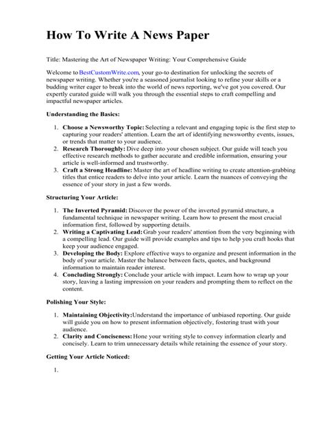 The headline is your first opportunity to grab the reader’s attention and convey the main point of the news item. It should be concise, informative, and engaging, summarizing the key event in as few words as possible. A well-crafted headline not only attracts readers but also provides context for the information that follows. Following the headline, the lead paragraph expands on the headline, providing a brief overview of the 5W’s and 1H: Who, What, When, Where, Why, and How. This paragraph is crucial as it sets the stage for the rest of the article, giving readers a clear understanding of the event’s significance.